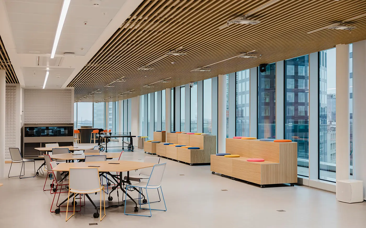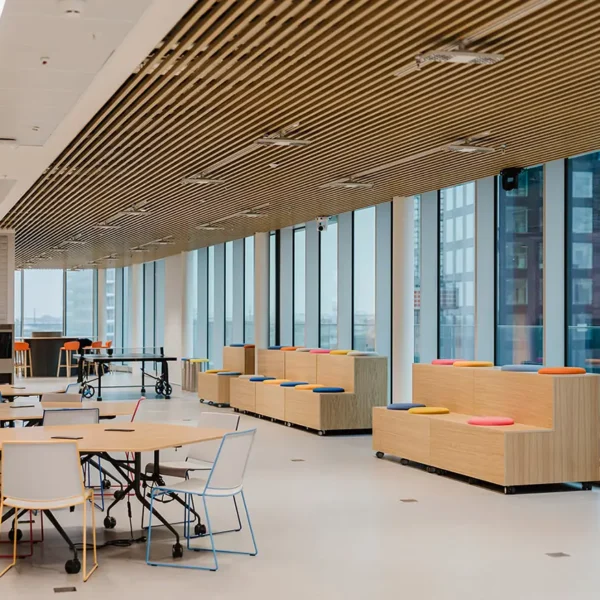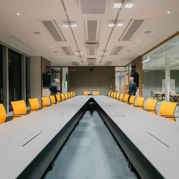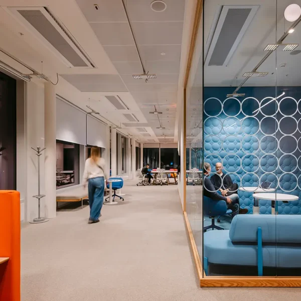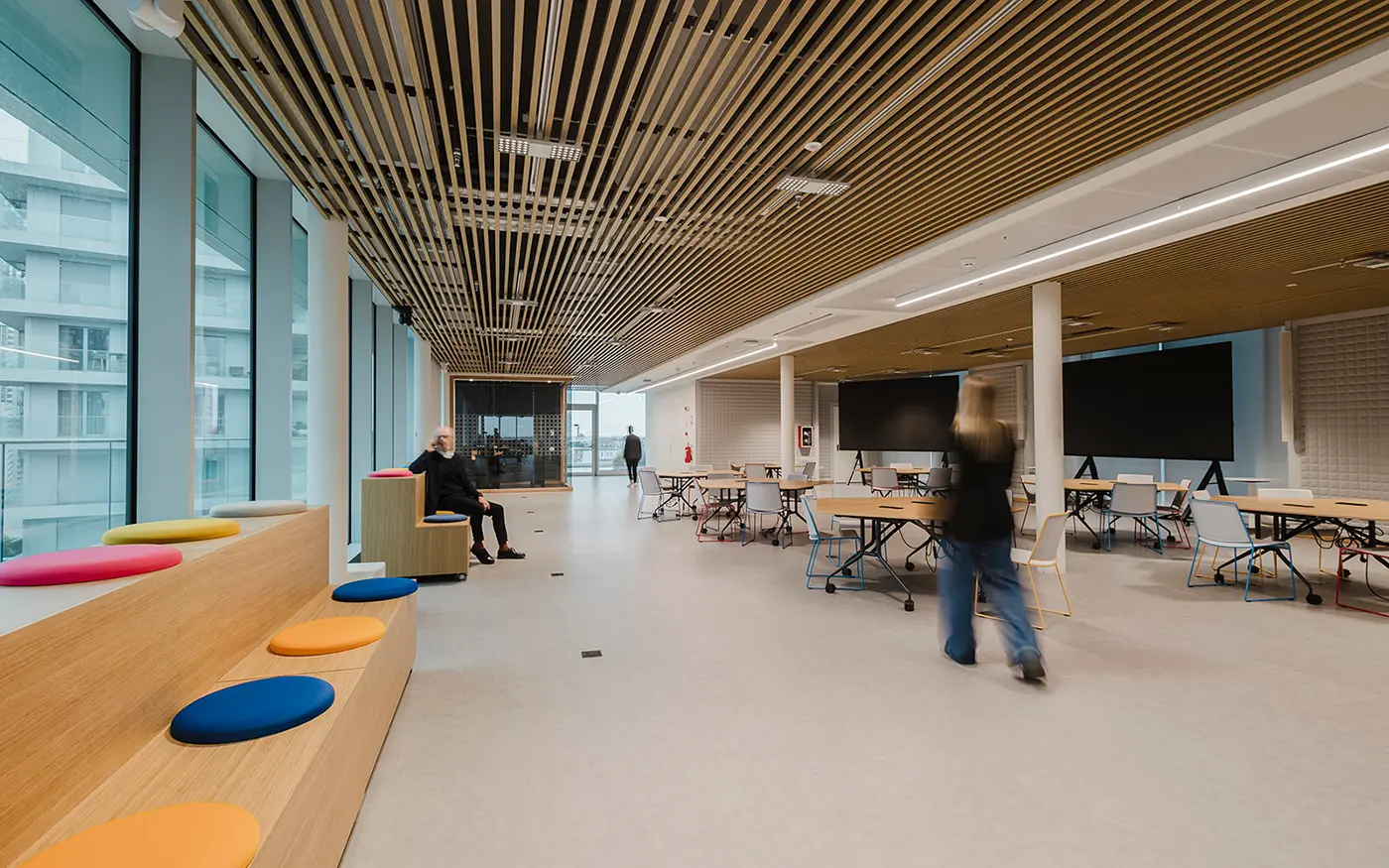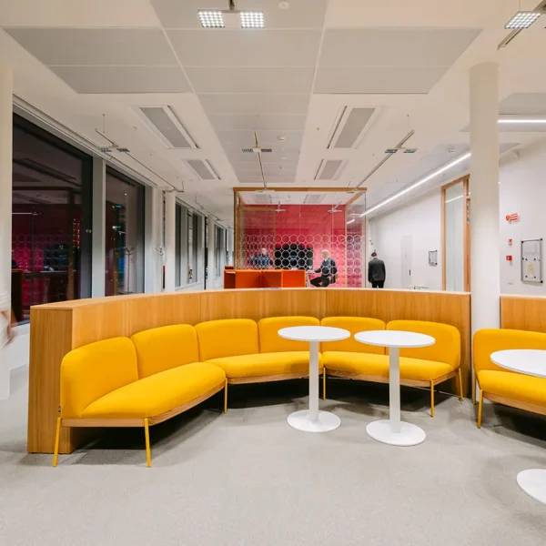 Le projet d’éclairage, basé sur une logique modulaire, accompagne la flexibilité des espaces intérieurs, en assurant des niveaux d’éclairement optimaux et adaptables aux différents usages. La lumière devient ainsi un véritable outil de qualité environnementale et de confort visuel, au service des nouveaux modes de travail.